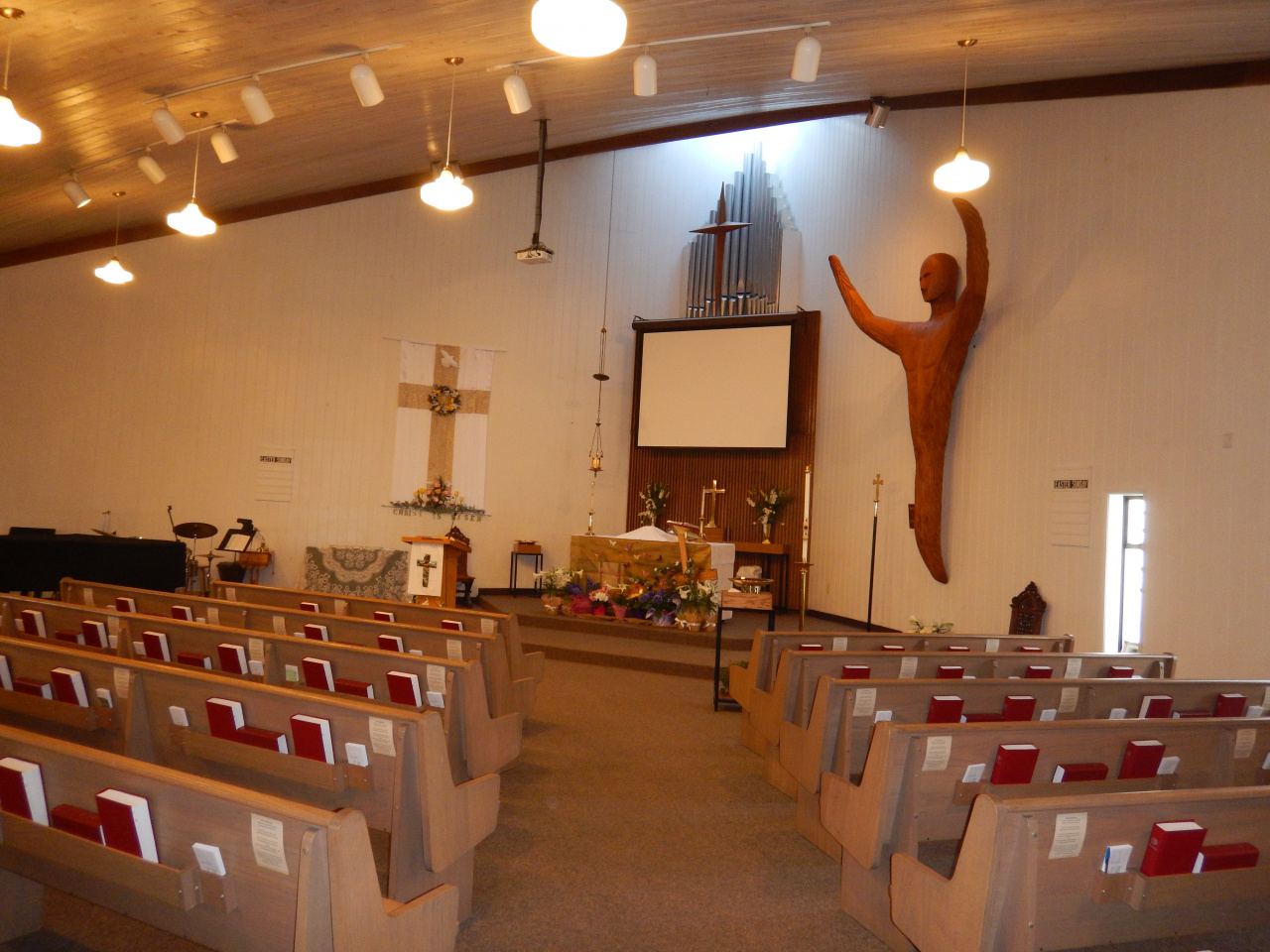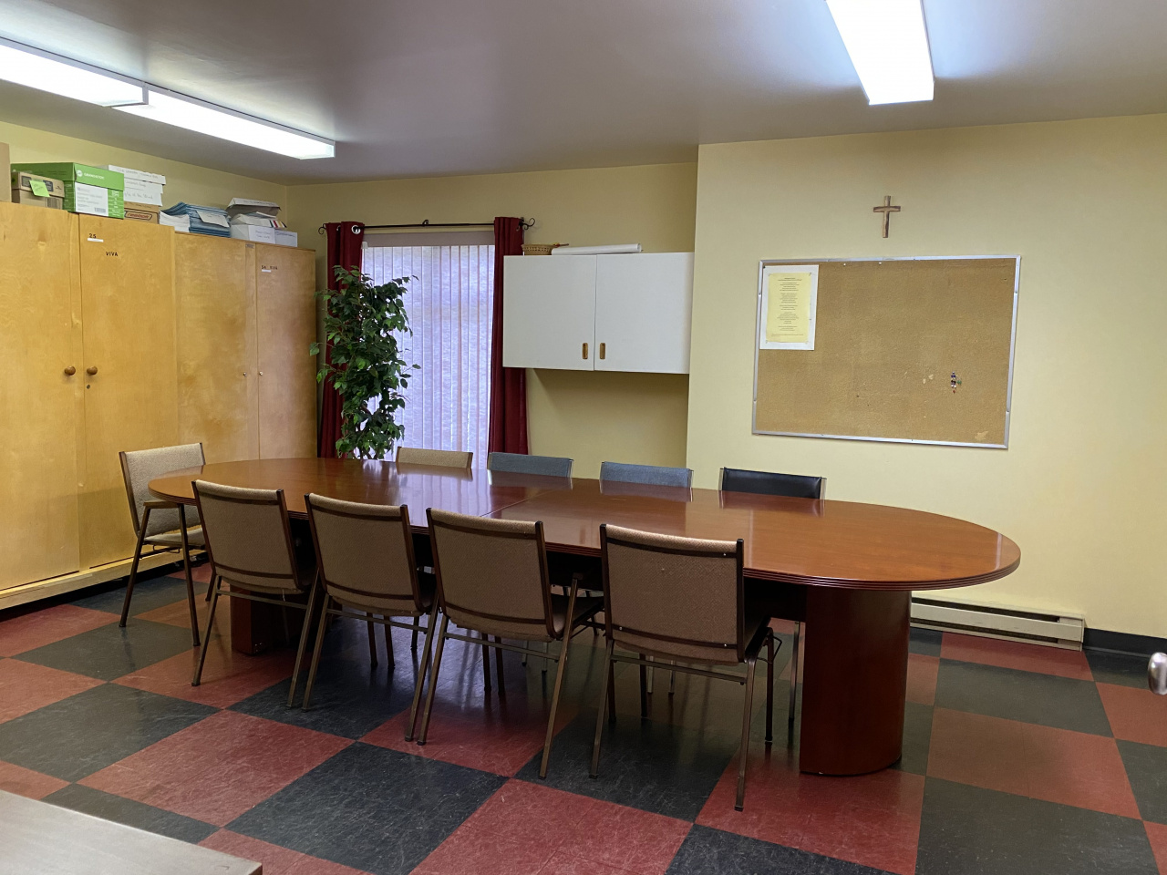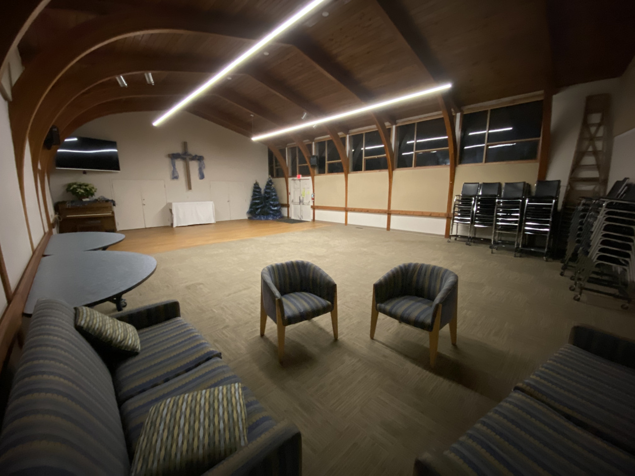 Description: A large room with an arched ceiling. Very good acoustics and equipped with audio-visual equipment (projector, microphones, speakers, computer for running projector), piano, and organ.